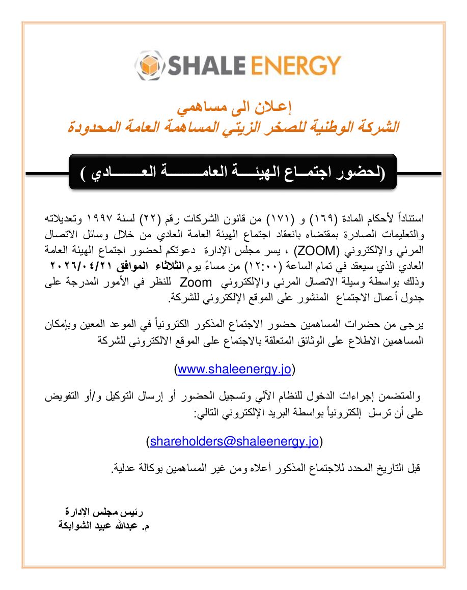 ShaleEnergy will be hosting its 18th Annual General Assembly Meeting on Tuesday 21th April 2026at 12:00pm via the online platform ZOOM.